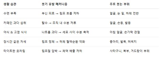 붓기 유발 습관 요약표 이러한 습관은 단기적인 붓기를 유발할 뿐 아니라, 장기적으로는 피로감, 부종 체질, 생리통 악화 등으로 이어질 수 있습니다.